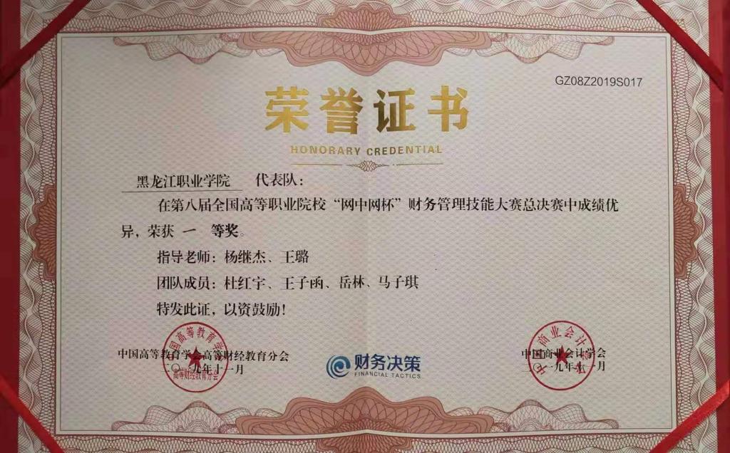 11月2日,在第八届全国高等职业院校“网中网杯”财务管理技能(财务管理决策)全国总决赛中,由会计金融学院教师杨继杰、王璐任指导教师,2018级会计专业学生杜红宇、马子琪、王子函、岳林组成的437ccm必赢国际官方网站代表队荣获全国一等奖。
