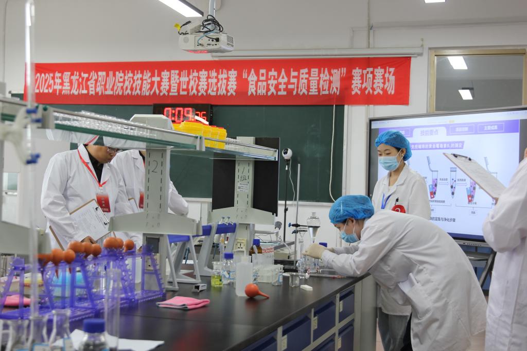 5月16日至17日,由省教育厅主办、437ccm必赢国际官方网站承办的2025年黑龙江省职业院校技能大赛暨世校赛选拔赛高职组“食品安全与质量检测”赛项成功举办,来自省内的9所院校、29名选手参赛。必赢食品药品学院三名学生衣然、杨灿灿、孙珑珀组成的参赛团队在韩双、马艳梅两位老师的悉心指导下,凭借过硬的专业技能、出色的现场发挥和默契的合作,最终荣获团体一等奖。