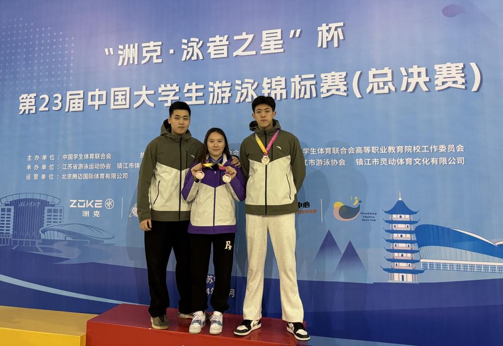 本次赛事由中国学生体育联合会主办、镇江市体育局承办,是我国大学生游泳项目的最高赛事之一,奥运冠军杨浚瑄,运动健将费立纬等名将参加本次比赛。大赛分为“北方赛区”和“南方赛区”,两个赛区每个项目的前12名运动员进入总决赛。经过刻苦训练和良好的现场表现,数字商贸学院魏影同学分别夺得女子乙组50米蝶泳第三名和女子乙组50米仰泳第三名,建筑工程学院王靖翔同学夺得男子乙组50米蝶泳第三名和男子乙组50米蛙泳第四名,建筑工程学院田浚滈同学获得男子乙组400米自由泳第八名。