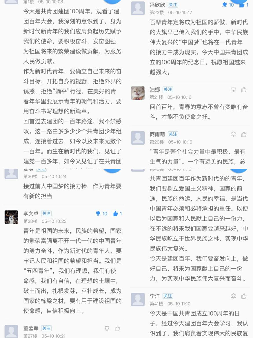 马院党总支书记程刚同志有感而发:今天观看了共青团100周年庆典。聆听了习总书记的重要讲话。这是在党的20大即将召开、抗击“疫情”取得阶段性胜利的时代背景下,召开的关于青年接班人培养的重要盛会。