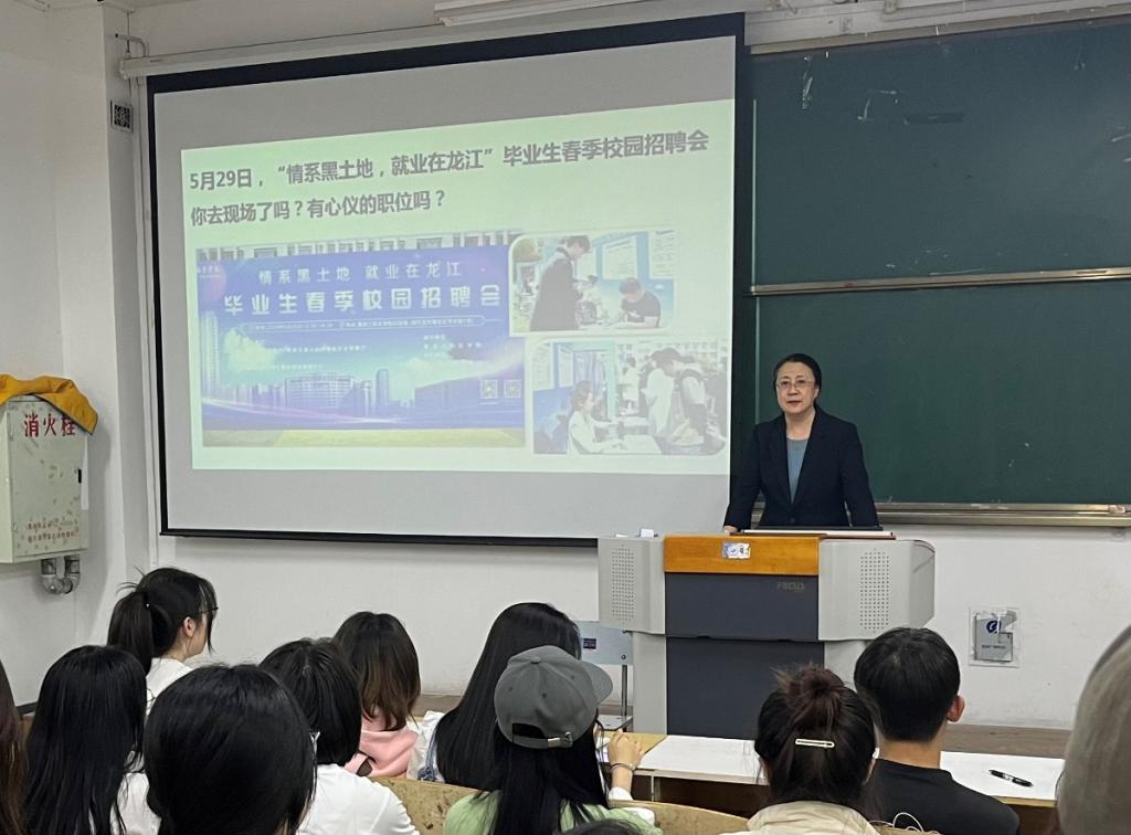 吴艳秋以学校近期举办的“情系黑土地,就业在龙江”毕业生春季校园招聘会为例导入新课内容,运用生动的语言、鲜明的事例、详实的数据,从就业形势总体稳定、就业压力仍存、多措并举促就业三个方面进行讲解。课堂上,她多次与同学们互动,了解同学们的所思所想,引导同学们正视就业竞争,树立正确的就业观和择业观,以健康的心态和积极的行动应对挑战,不断提升自身的综合素养,做好个人职业规划。最后,她与学生们分享了今年出台的最新就业政策、黑龙江省高校毕业生等青年就业创业政策以及学校为学生提供的就业信息平台等。