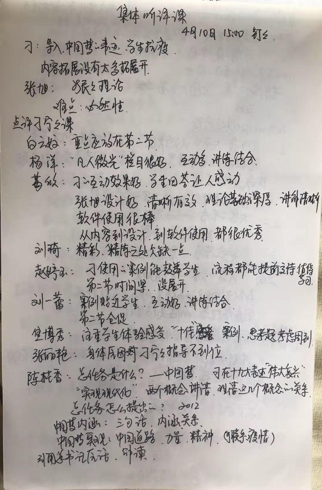 高政治站位,夯实责任。疫情防控是一场阻击战,总体战,人民战争。在这场全民战争中,每个人都不是旁观者,作为一名思政课教师更要提高政治站位,扛起肩上的责任,化“危”为“机”,教育引导学生正确对待疫情,深刻认识国情,厚植爱国情怀,坚定“四个自信”。停课不停学,质量不打折,为指导教师更好适应线上教学,增强学生的获得感,思想政治教研部组织开展示范教学,八名教师勇挑重担,精心准备,以实际行动践行使命担当,投身抗疫,共克时艰。