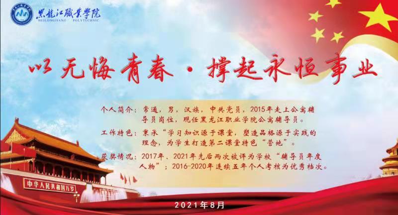 在中共黑龙江省委宣传部和中共黑龙江省委教育工作委员会联合举办的第十三届“黑龙江省高校辅导员年度人物”暨2021年“黑龙江省最美高校辅导员”推选展示活动中,经学校推荐、资格审核、专家外审等程序,学校公寓辅导员常通经过层层选拔成功入围网络述职答辩环节,并在8月5日举行的“VS互动云”网络平台述职答辩中,荣获第十三届“龙江高校辅导员年度人物提名”荣誉称号,位列全省高职院校参评选手第二名。