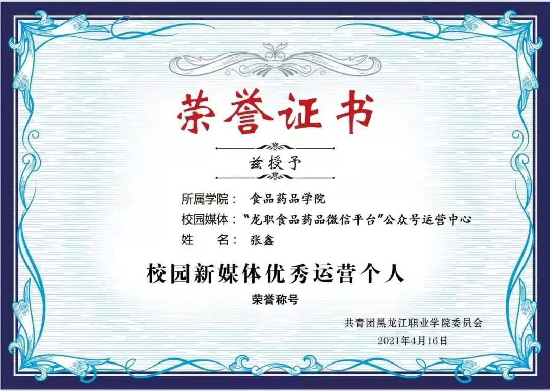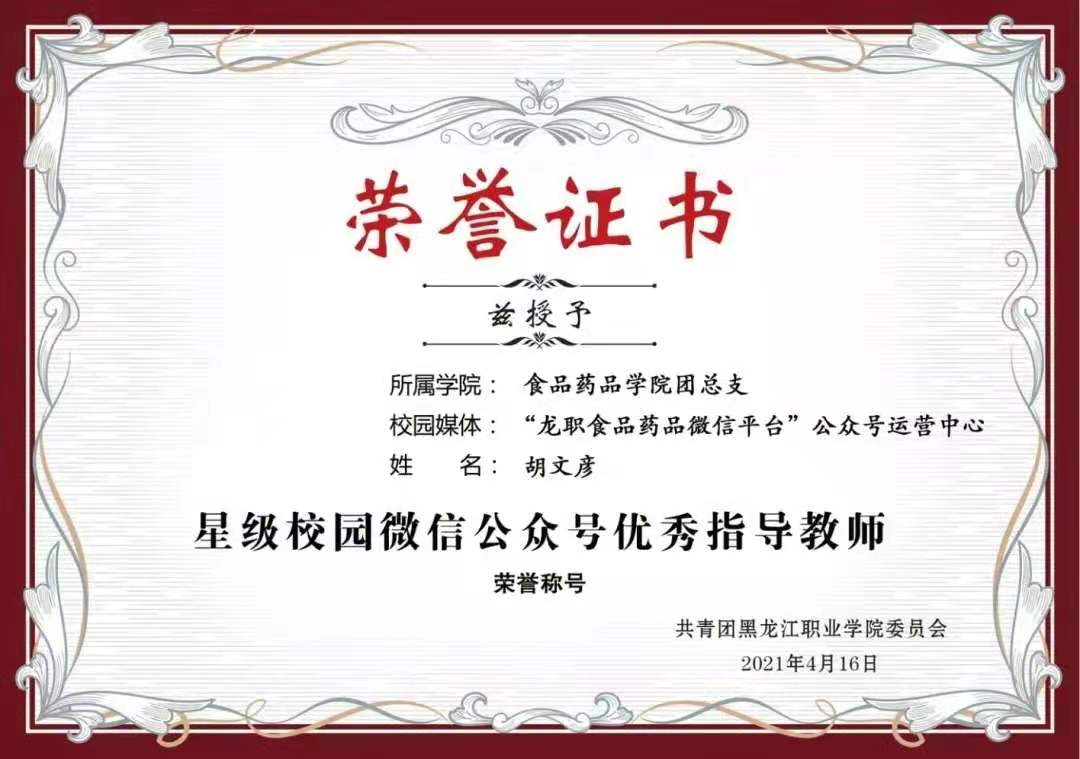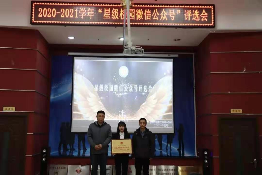 在二校区,经过各学院述职,食品药品学院脱颖而出,荣获2020-2021学年“星级校园微信公众号”荣誉称号;食品药品学院团总支书记胡文彦老师荣获“星级校园微信公众号优秀指导教师”荣誉称号;食品药品学院学生新媒体中心主任张鑫同学荣获“校园新媒体优秀运营个人”荣誉称号。