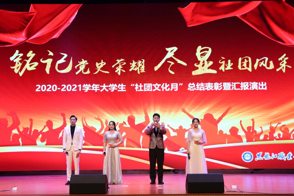 4月29日,437ccm必赢国际官方网站2021年“铭记党史荣耀·尽显社团风采”大学生社团文化月总结表彰暨汇报演出在工匠楼三楼隆重举行。本次活动由校团委主办,校大学生社团联合会承办。校团委书记邹春雷、副书记杜超、组宣办主任唐晓恬、校团委学生副书记刘丽利,社团文化月赞助合作单位哈尔滨品皓教育学校校长孔令业、副校长高学亮出席活动,校院两级各类学生社团会员代表等近800人参加活动。
