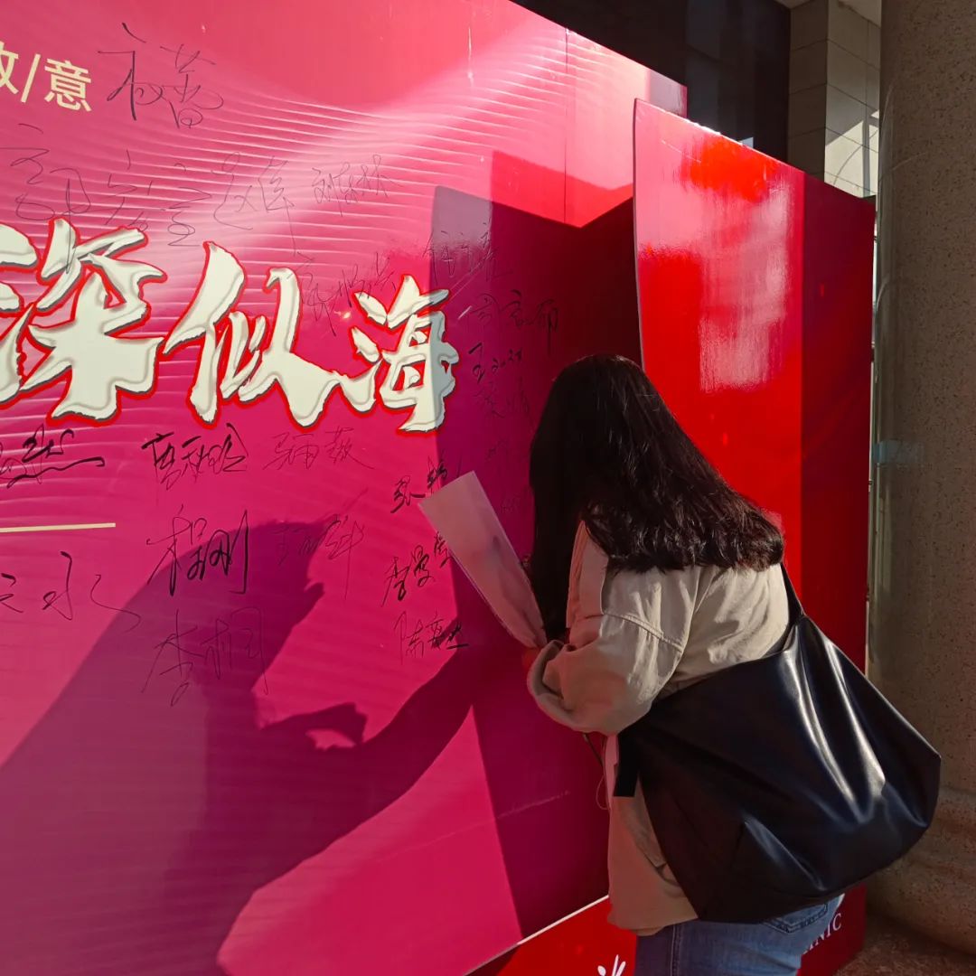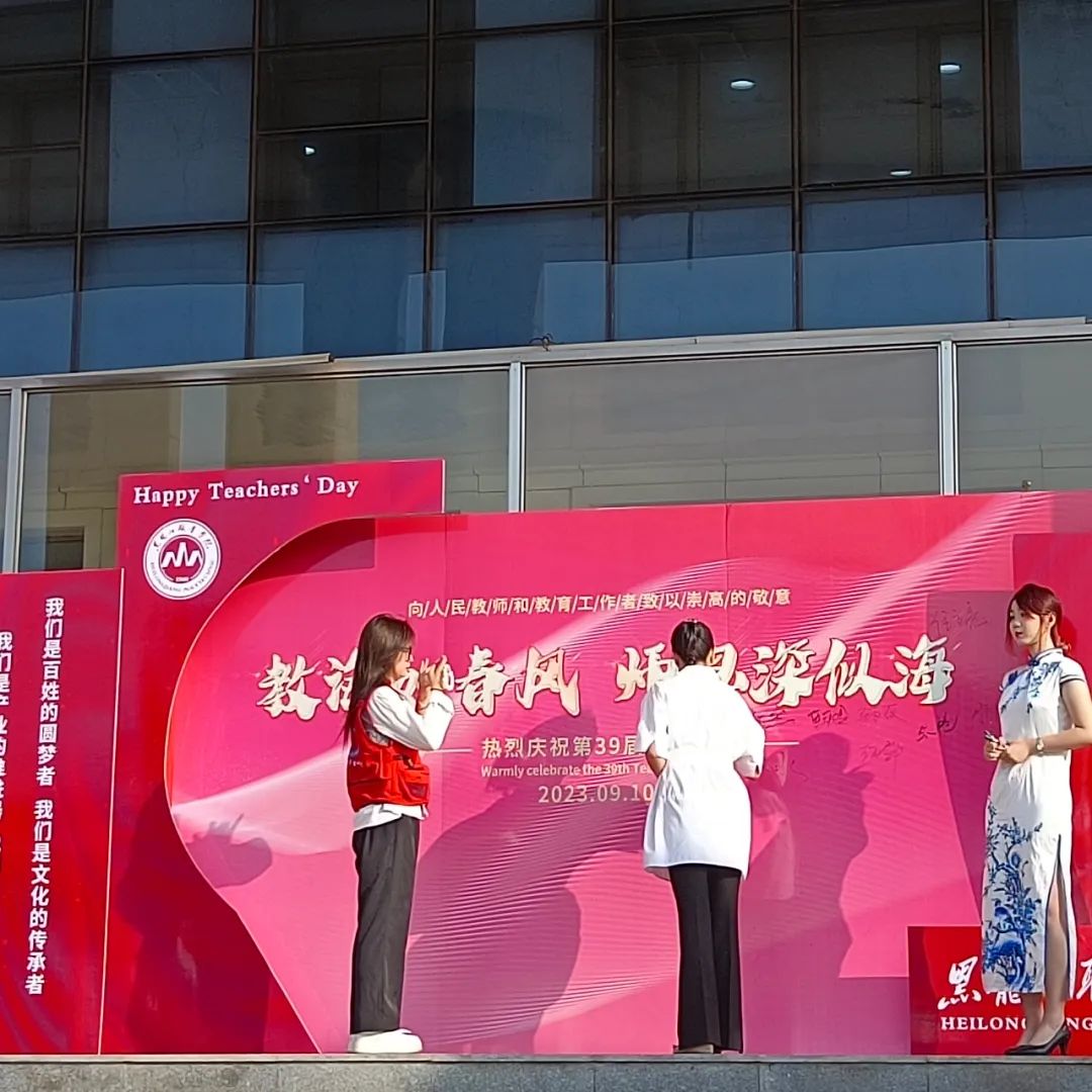 9月11日清晨“龙职”校园里到处弥漫着庆祝教师节喜庆温馨的氛围,来自一校区六个分院的学生代表身穿各分院院服,在清华楼门前整齐的站成两列,为老师们送上节日的祝福。一句句问候“老师,您辛苦了!”、一个个深深的鞠躬、一朵朵鲜艳的康乃馨……无不表达着“龙职”学子对老师最深切的祝愿。许多手持鲜花的教师都感动的走到签名墙前,拍照留念记录这幸福的时刻。