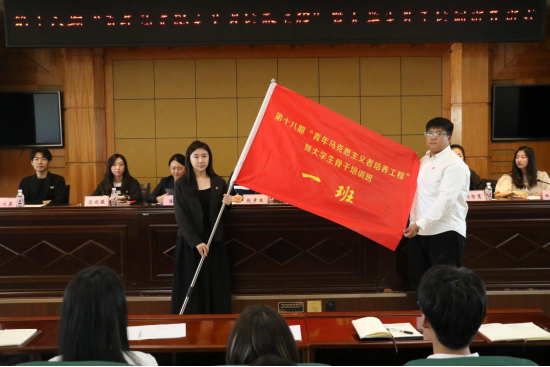 由校学生会主席、青马班班长李靖媛代表青马班学员做大会发言,青马班带班导师魏然老师分别向10个小班班长进行授旗,校学生会主席、青马班班长李靖媛带领全体青马班学员进行宣誓。