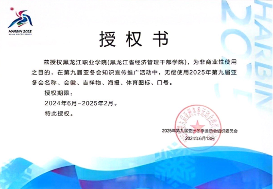 近日,必赢荣获2025年第九届亚洲冬季运动会组织委员会颁发的亚冬会标志非商业性使用授权书,兹授权437ccm必赢国际官方网站(黑龙江省经济管理干部学院),为非商业性使用之目的,在第九届亚冬会知识宣传推广活动中,无偿使用2025年第九届亚冬会名称、会徽、吉祥物、海报、体育图标、口号。