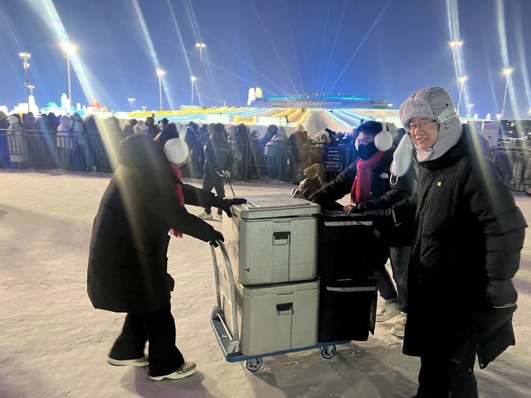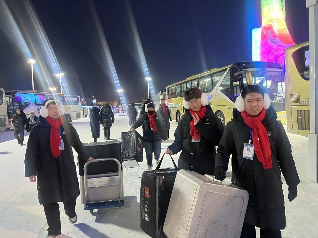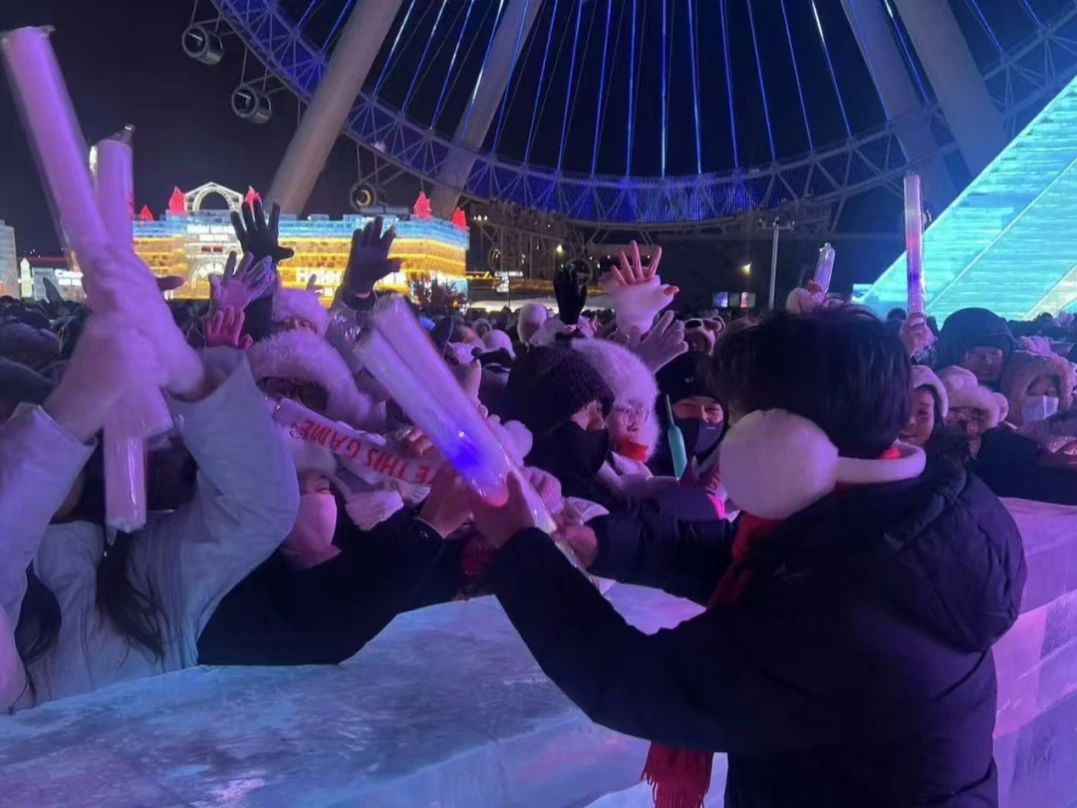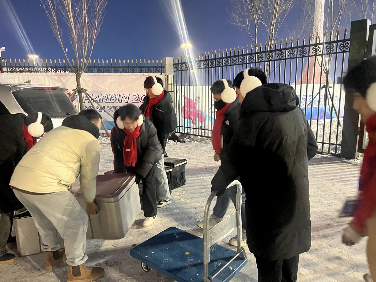 活动当日,志愿者们早早抵达冰雪大世界,迅速投入到紧张而有序的工作中。从31日上午10点直至次日凌晨,志愿者们始终坚守岗位,毫无怨言。他们的身影穿梭在冰雪大世界的每一个角落,肩负着协助演出的重任。从舞台布景的搭建与调整,到各类演出道具的搬运与摆放,每一个环节都有他们忙碌而专注的身影,沉重的道具在冰雪地面上拖行,只为确保每一场演出的道具都能精准就位。后台候场区域,同样有着志愿者们忙碌的身影,他们时刻准备着,为演员们提供所需的一切帮助。演出开始之后,志愿者们手拿荧光棒,热情地送到每一位观众手中,还不忘提醒大家注意安全,尽情享受这欢乐的时光。