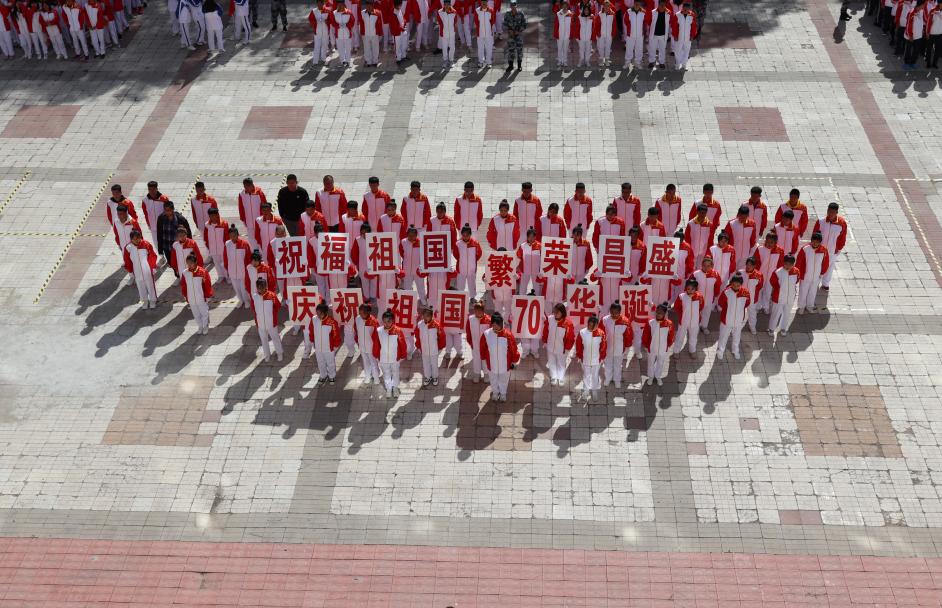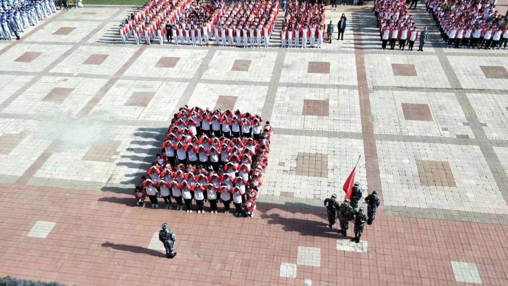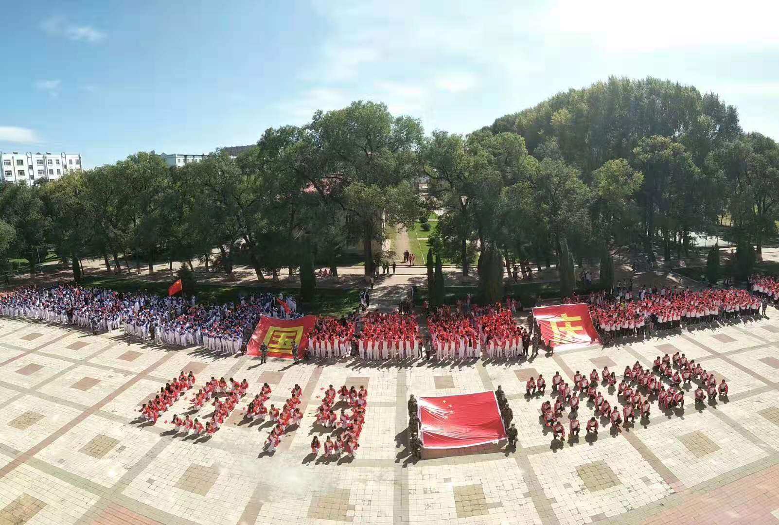 在大会即将结束之际,由学工部精心策划编排,1600余名师生共同参与演绎了《我和我的祖国》快闪活动,200名同学围绕国旗,拼凑成“1949——2019”字样,国旗护卫队员高举“国”“庆”二字,寓意新中国成立70周年举国欢庆之意,全体同学摇动手中红旗共同演唱《我和我的祖国》,充分展现了校区2019级“龙职”学子内心庆祝新中国成立70周年的爱国之情与喜悦之意,为期十几天的军训在同学们“祝贺伟大祖国繁荣富强”高声祝福中圆满结束。