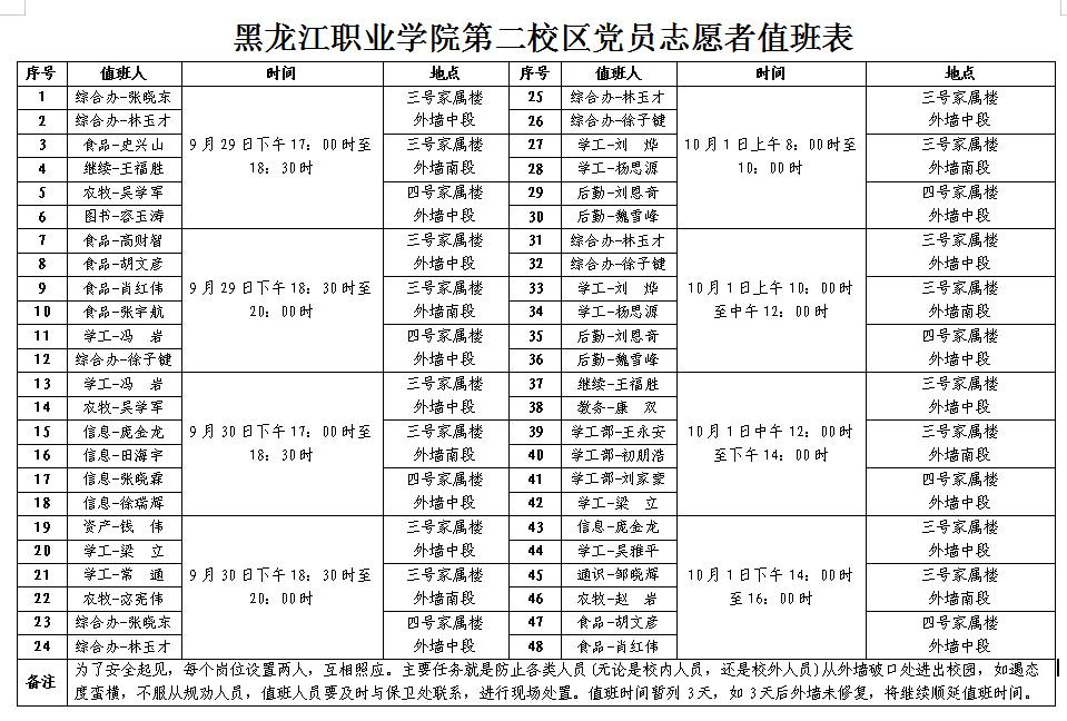 第二校区三号、四号家属楼正在进行老旧小区改造,为方便大型机具入场施工,将原有的围墙扒开了几道缺口,一些施工人员及外来人员进进出出。为避免形成校园防控漏洞,保卫处加大警力严防死守,由于连续作战,人员极度疲惫,给防控工作带来了极大压力。为了解决这一问题,第二校区党员志愿者服务队发出行动倡议,召集党员志愿者加入到治安防控队伍,清除防控隐患。全体党员志愿者踊跃报名,主动申领任务,有的同志还连班连岗,他们不计较得失,不讲条件,牺牲了休息时间和十一假期,表现出了共产党员不怕吃苦,勇于奉献的高风亮节。党员志愿者的行动,引来群众一致赞叹,纷纷伸出大姆指,为党员志愿者点赞。