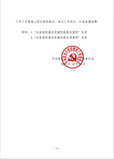 10月15日,黑龙江省委教育工委印发《关于公布全省高校基层党建创新案例评选结果的通知》。学校党委委派综合办公室党支部选送的《结“红色对子”,探索建立“党建合作社”》,经省委教育工委组织专家匿名评审,被评为“全省高校基层党建创新优秀案例”。近期优秀案例将汇编成册,供各高校学习借鉴。