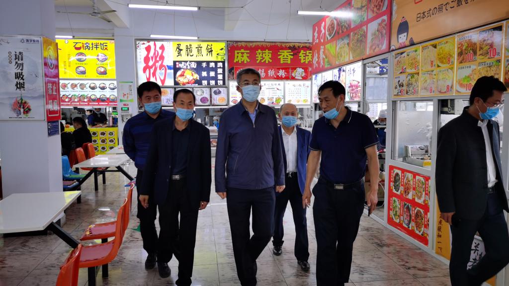 在饮食服务中心,王利文向郝传龙主任详细询问了学生错时就餐、食物采购、食品安全等情况,要求饮食服务中心一定把安全放在首位,细化各项措施,明确防控标准,强化场所管理,不折不扣做好防疫消毒工作,确保师生员工用餐安全。同时,要加大宣传力度,教育和引导学生厉行节约,反对浪费。