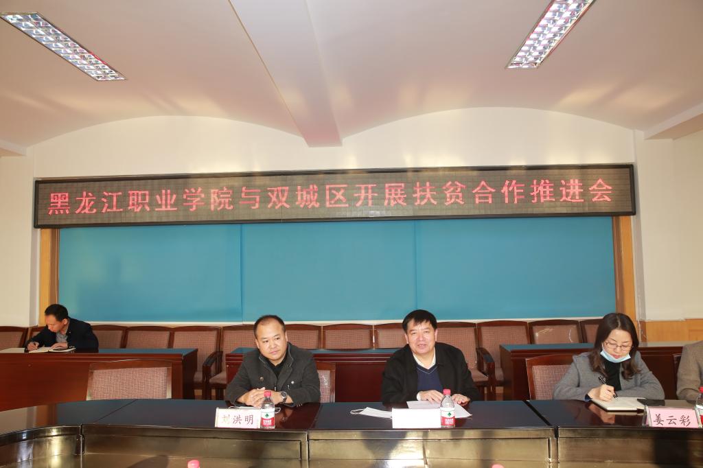 10月26日,437ccm必赢国际官方网站与双城区开展扶贫合作推进会在第二校区举行。学校党委委员、组织部部长钟敏强,省扶贫专班成员、双城区扶贫开发工作办公室副主任张孝君,双城区扶贫办督导科科长姜云彩,黑龙江深正文化传媒有限公司总经理刘洪明,信息工程学院党总支书记王文焕,信息工程学院教学负责人卢凤伟参加会议。会议由钟敏强主持。