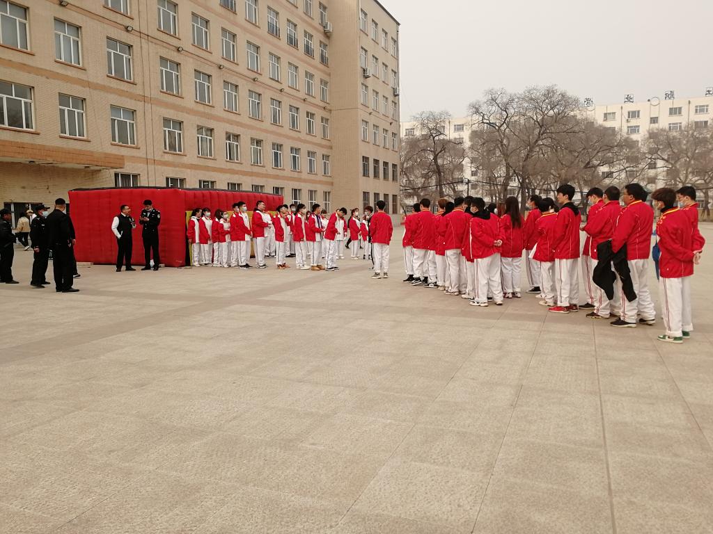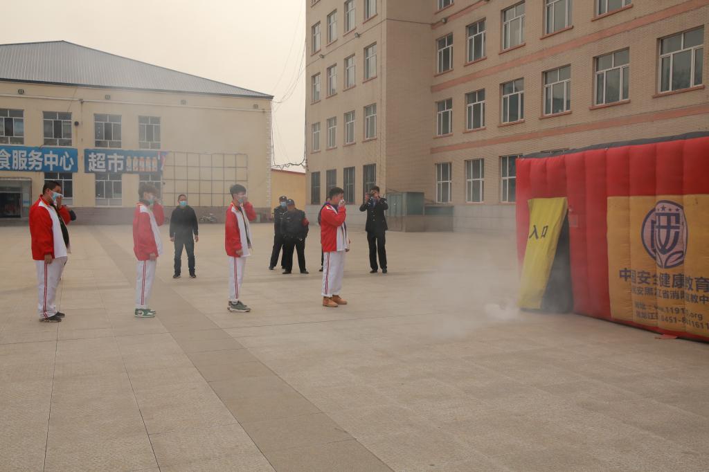 培训结束后,大家按照要求来到二号教学楼前广场,实地进入点燃发烟罐的“模拟逃生训练屋”,要求在16秒内逃出,否则会造成窒息。同学们严肃认真地参加了演练,他们排着整齐的队伍,用毛巾捂住口鼻,猫着腰先后进入训练屋,结果有很多同学都没有在计划时间内逃出,同学们一致认为,在发生火情的房间内,如不快速逃生,浓烟才是令人窒息的真正原因,这种体验刻骨铭心。