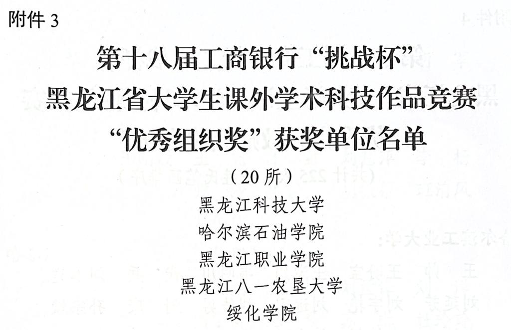 近日,必赢喜获第十八届“挑战杯”黑龙江省大学生课外学术科技作品竞赛“优秀组织奖”。