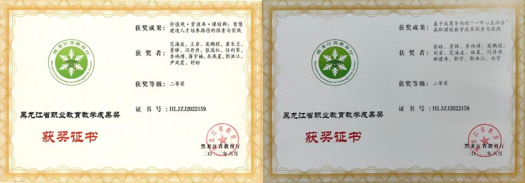 学院多次荣获省级及校级教学成果奖。2022年,范海波、张皓申报的教学成果荣获黑龙江省职业教育教学成果二等奖;2024年,学院共获校级教学成果奖4奖,范海波、张皓、英鹏程三位教师为主持人的教学成果在省级教学成果奖申报中脱颖而出,占据了必赢申报省级教学成果奖中的三席。学院将不断提升教育质量,为培养适应时代需求的高素质技能型人才贡献力量,持续推动学院教育教学迈向新的高度。