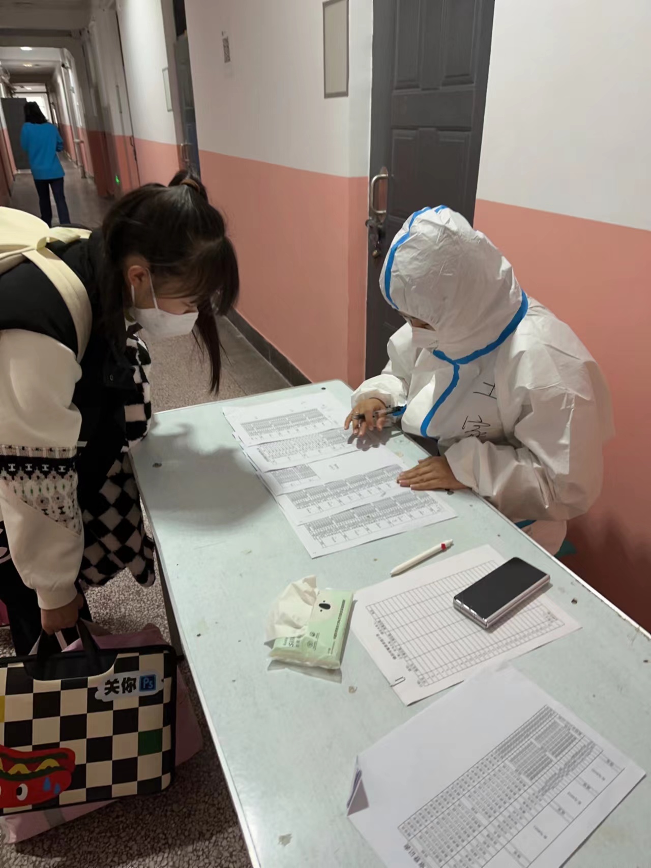 29日是新生报到的第一天,老师们在6点钟就已经到达各自所在楼层,开始了一天的忙碌工作:登记学生入住信息,告知新生注意事项,帮助学生把行李搬送到寝室,与楼层送餐志愿者对接取餐,负责每个寝室一日三餐的发放,统计第二天早中晚三餐用餐人数,组织学生有序进行每日一次的核酸检测,随时排查是否有突发疫情地区的学生等。因不确定学生会不会有突发情况,老师们每天都是坚守岗位到23点,确定学生入睡以后才敢去休息。