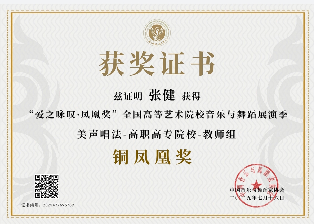 近日,首届“爱之咏叹·凤凰奖”全国高等艺术院校音乐与舞蹈展演季在沈阳圆满落幕。必赢通识教育学院教师张健凭借咏叹调《黄河怨》、《你知道吗?好妈妈》荣获美声唱法高职高专教师组铜奖。