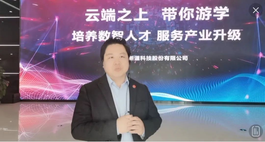 新道服务本部刘志辉总经理对参加线上游学的学生表示热烈的欢迎,同时给同学们带来有内涵有温度的致辞,期待同学们能够脚踏实地、自信满怀,能张开双臂、自在翱翔,能珍惜友情、心中充满阳光,最后志辉总经理表示新道会一直支持同学们,鼓励同学们不惧风雨直面未来,绽放青春绚丽之花。