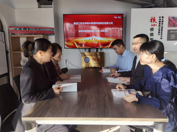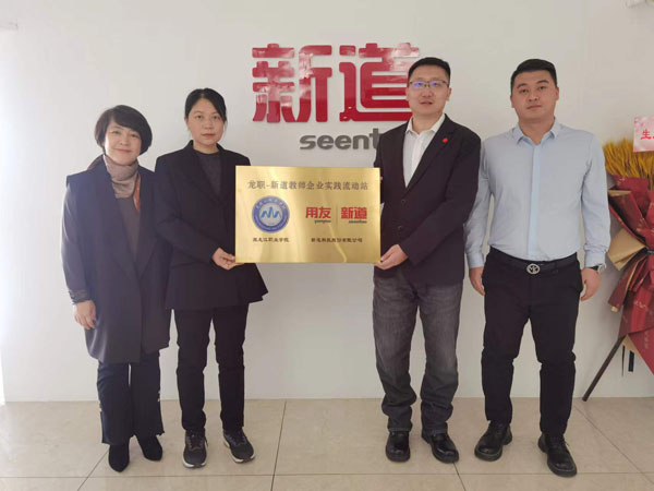为贯彻《深化新时代职业教育“双师型”教师队伍建设改革实施方案》及《职业教育提质培优行动计划(2020—2023年)》等文件精神要求,进一步探索产教融合、校企合作的长效机制,437ccm必赢国际官方网站联合新道科技股份有限公司共建教师企业实践流动站。11月22日,学校会计金融学院会计信息管理教研室主任张丽静、教研室骨干教师韩雪英与新道科技黑龙江省区总经理李毅飞共同为教师企业实践流动站揭牌。