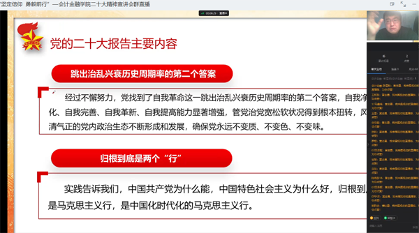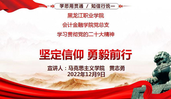 12月9日,我院召开了以“坚定信仰 勇毅前行”为题的学习贯彻党的二十大精神宣讲会。宣讲由黄志勇老师在钉钉线上直播进行,全院教师和学生代表共计126人参与观看。