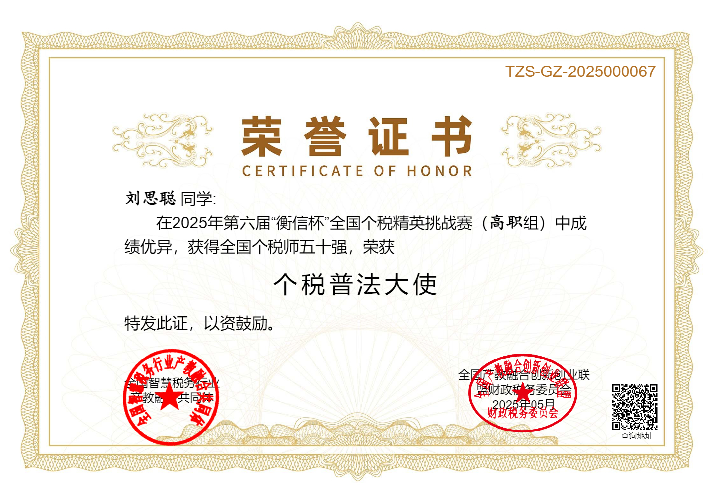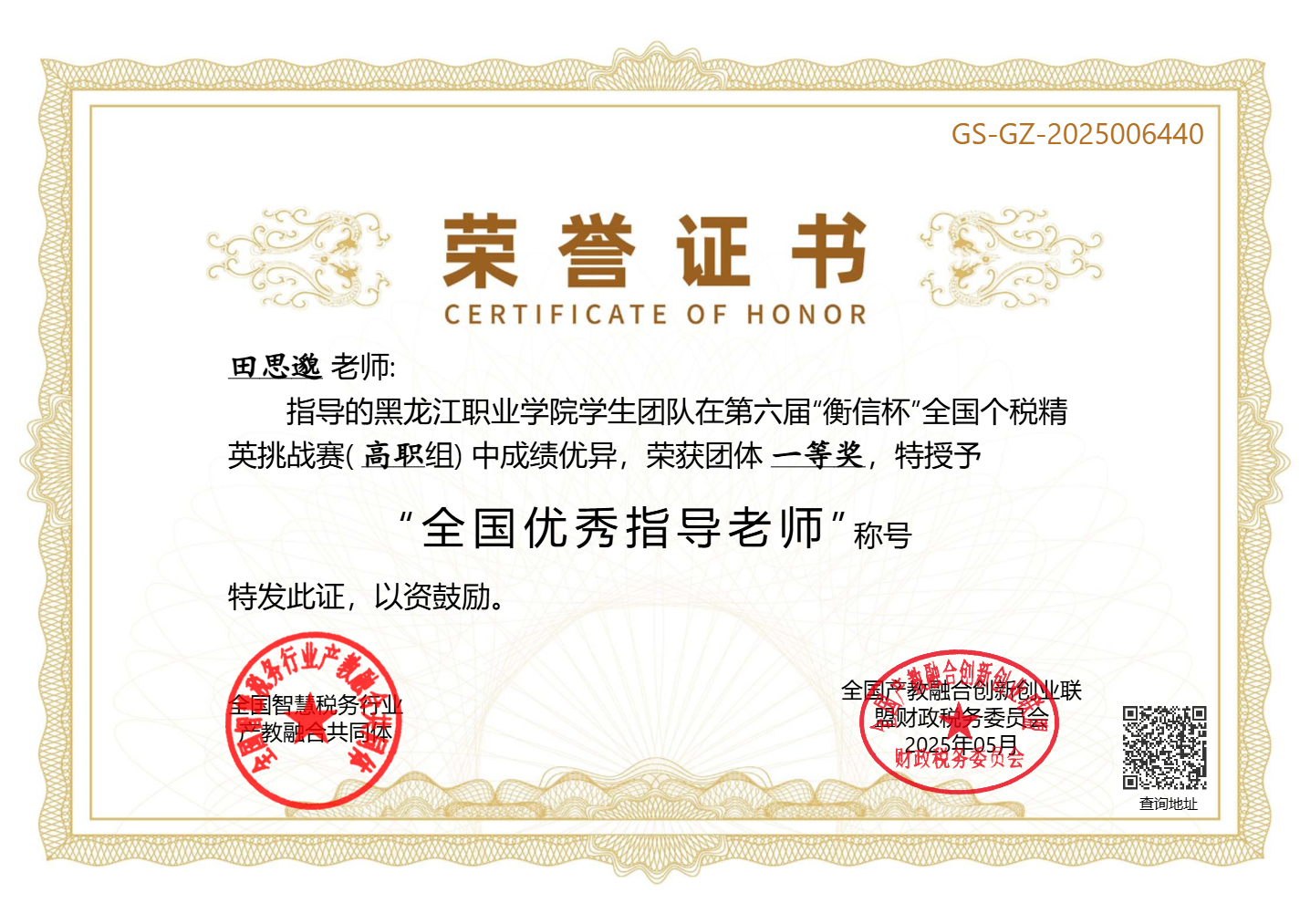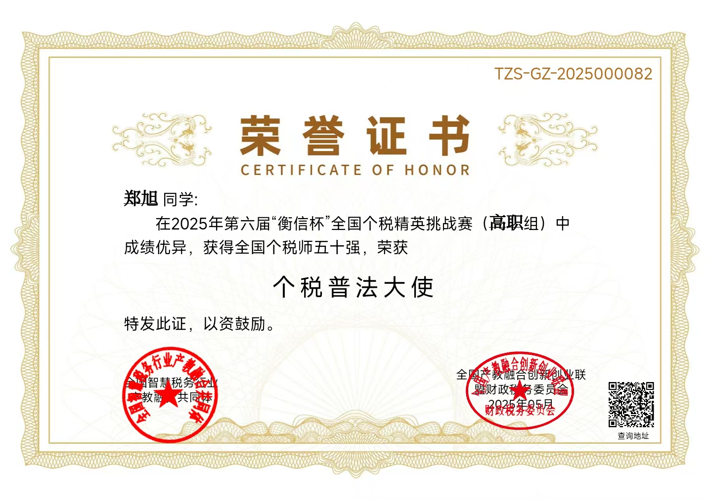 我院由齐星辰、田思邈、杨继杰、王欢、包微微组成的指导教师团队,组织大数据与财务管理专业、大数据与审计专业、大数据与会计专业共42名学生积极参赛。经过连续14天的知识和技能比拼,在全国150多所高职院校竞技中,我院最终获得全国总排名第二、团体一等奖的好成绩,8名学生在15000名选手中脱颖而出,进入全国排名前50,获得“个税普法大使”荣誉,5位指导教师分别获得“全国优秀指导教师”称号。