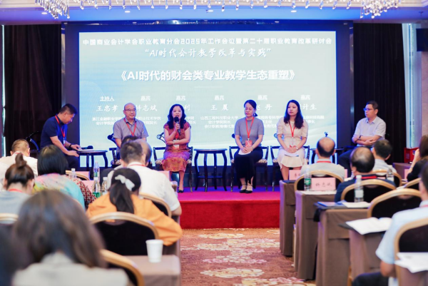 当日下午,张利院长参与了“AI时代的财会类专业教学生态重塑”圆桌讨论环节。面对AI技术给传统财会教育带来的巨大冲击与全新机遇,张利院长结合会计金融学院教学改革的创新与突破及行业发展趋势,进行了经验分享及对AI背景下,财会专业建设的展望。她指出,财会专业教育必须主动拥抱AI技术,将其融入到教学改革的各个方面,要着重培养学生的数据分析、智能决策等新型能力,以适应行业变革需求。除张利院长外,其他与会专家也围绕会议主题展开深入讨论。