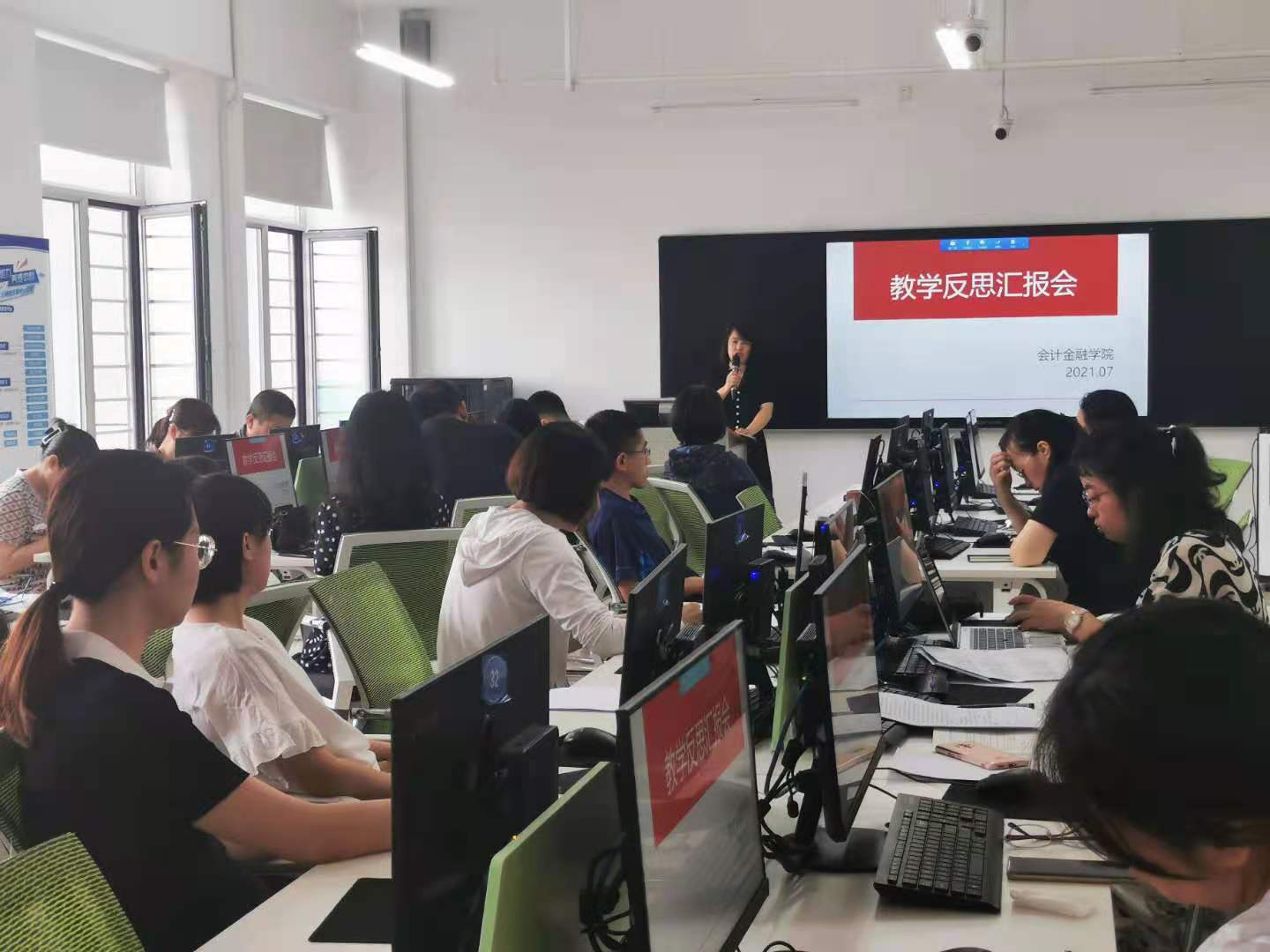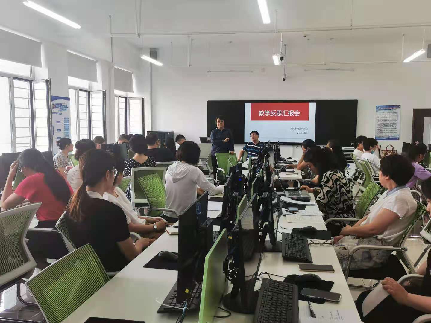 教学副院长张振和在会议开始宣读龙职教务〔2021〕6号文件,紧接着来自六个教研室代表教师进行经验分享。会计信息教研室副教授韩雪英老师,结合《会计综合实务》这门课程,从课程设置、教学资源和教学效果三个方面进行课程教学反思;金融管理教研室青年教师屠姝围绕着如何激发学生学习兴趣为主进行课程教学反思;会计教研室主任、资深教师杜国用结合《初级会计实务(一)》的教学资源、教学设计、教学方法进行深刻反思,并提出要以积极态度对待学生,努力提升自身的教授水平;会计基础教研室青年教师吕红美通过梳理课程内容以及授课时间,结合学生心理变化和上课状态进行教学反思,并表示今后将结合OBE教学改革要求,努力做到将课堂还原给学生;资产评估与管理教研室赵春雨结合本学期期末学生成绩分布状况,剖析学生成绩较低原因,并提出今后将改进教学方法手段,充分调动学生积极性;财务管理教研室陈雪松从教学目标及能力达成、教学内容与教学方法、学生成效分析、评量方法和课堂教学五个方面进行课程反思,表示今后将优化信息化资源,提升趣味性课堂效果。每位教师经验分享后,院长鞠永红、教学副院长张振和都会进行总结点评,并给出相关的建议。