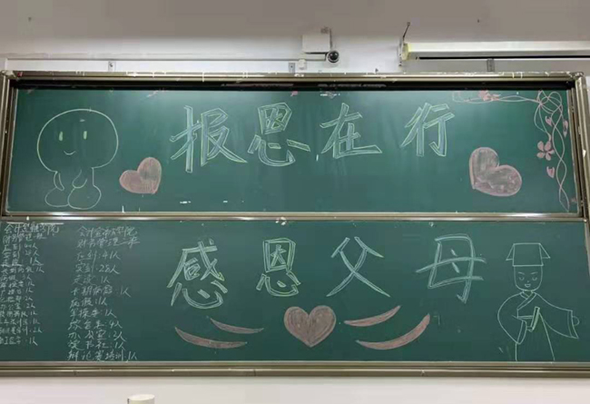 在各班级负责人的组织下,同学们提前准备好了场地布置工作,随后班级负责人登上讲台,开始通过演讲、播放PPT、歌曲、影片等方式使同学们对感恩有了进一步的了解以及懂得感恩的真谛。随后又通过小组讨论的方式来让同学们互相交流,表达自己曾经对父母的感恩方式,这既让同学们对这方面的相关知识有了更深的了解,又加强了同学们的默契和团结。最后,同学们拿出准备好的笔和信封,将自己这段时间对父母的关怀和想念写在纸上,交给班级负责人统一邮寄回家。在拍照留念后,这次“感恩父母 报恩再行”的主题班会活动便就此落下帷幕。
