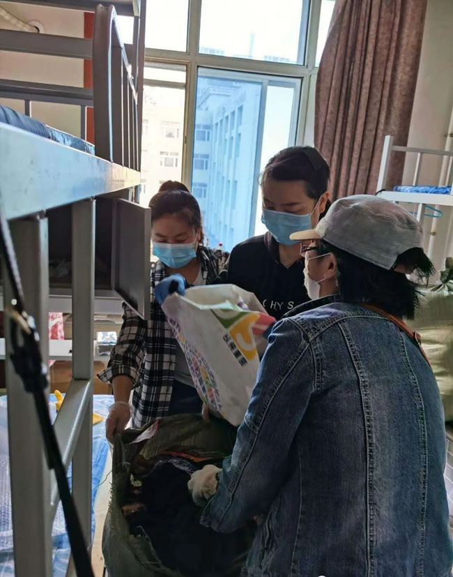 5月23日,分院学管院长、学管办主任、专职辅导员7人,兼职辅导员3人,共12人另携4名家属准时到达培训楼,经过扫码和体温检测后,按照分工大家各司其职、各负其责有序开始学生寝室的打包,现场与学生视频通话、物品标记和搬运工作。10点10分,完成了所有学生的物品搬运和寝室的清空。