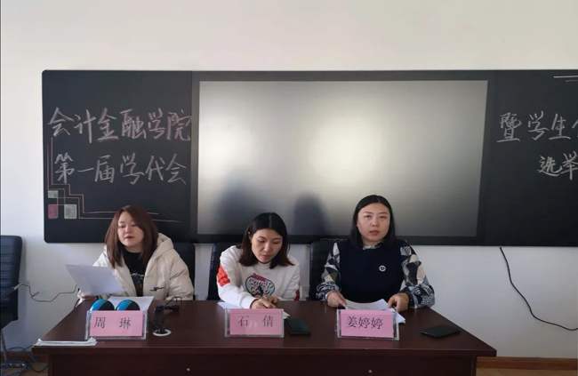 会议第二项由41名学生代表举手投票表决一致通过代表团团长为刘旭野担任、副团长为贾英琦担任、联络员为张倩菲担任。并确立会计金融学院学生代表团成立。