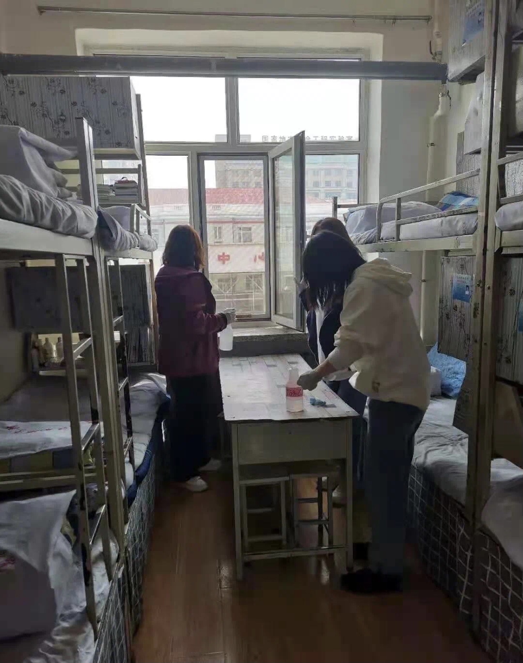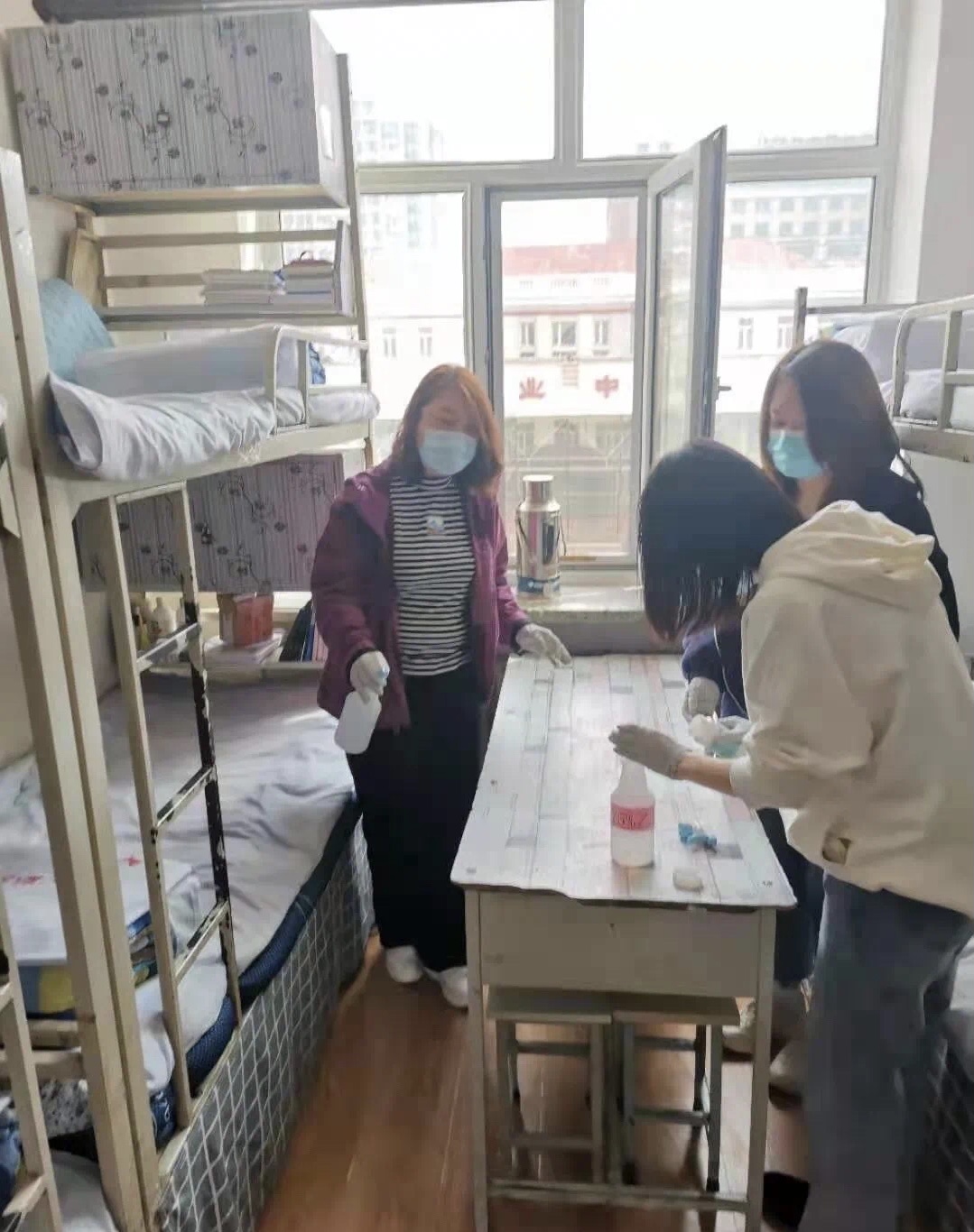 我院辅导员深入学生宿舍,对寝室规范用电、卫生等情况进行检查,并对学生寝室全面消毒!并对在寝学生的思想动态、学习生活进行了解和关怀。