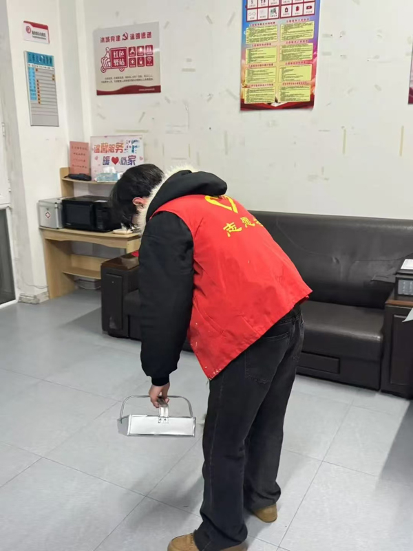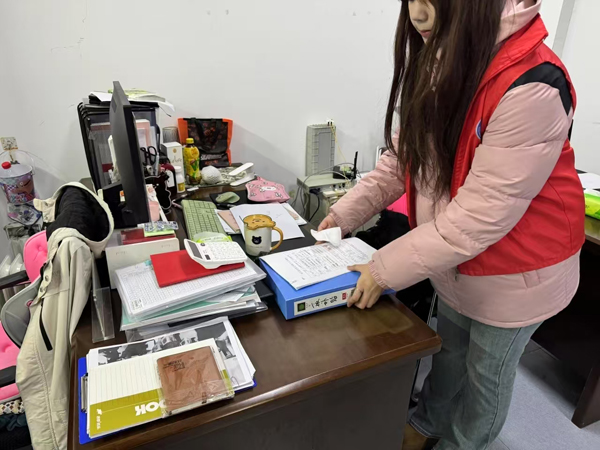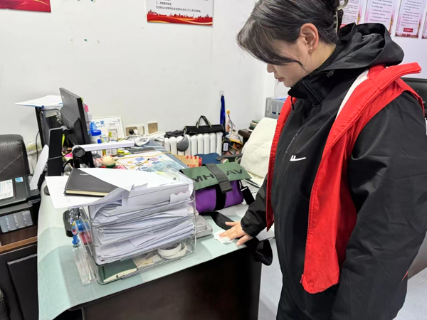 抵达东方瑞景社区后,志愿者们迅速按照事先周密制定的计划,有条不紊地投入到紧张而有序的义务劳动中。他们手脚麻利地将散落在桌面、柜子上的文件资料进行细致分类与整理,耐心地将每一件物品归位摆放,为工作人员后续的查阅工作提供了极大便利。紧接着,抹布“大军”闪亮登场,志愿者们或弯腰俯身,或踮脚伸手,不放过任何一个卫生死角,电脑、打印机、文件柜等办公设备在他们的精心擦拭下,逐渐褪去尘埃,焕发出洁净明亮的光泽。大家各司其职,又紧密配合,在忙碌的劳动中深切感受到了奉献带来的无尽快乐,他们不仅用勤劳的双手传递着温暖与关爱,更用真挚的心灵诠释着青春的价值与意义。