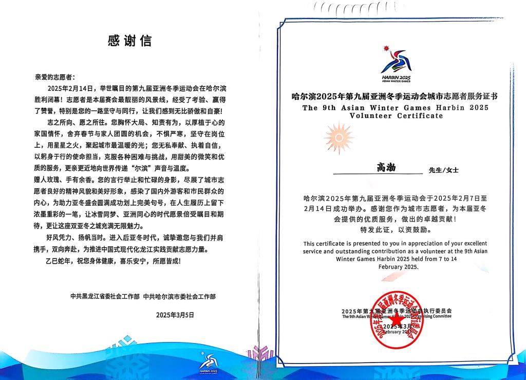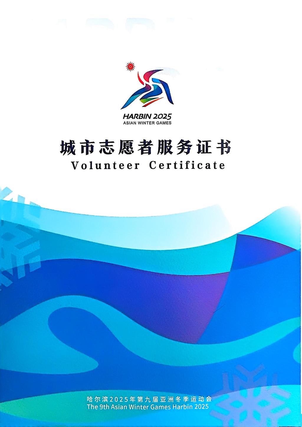 我院同学荣获第九届亚冬会志愿者服务城市志愿者服务证书