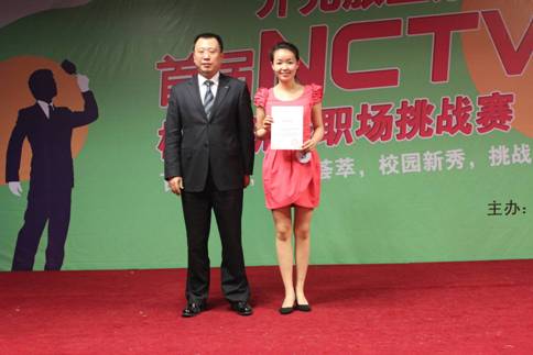 09级赵宝华同学以实习生身份参加开元酒店集团“职场新秀挑战赛”获得长春开元名都大酒店的第一名,高福权总经理为其颁奖。