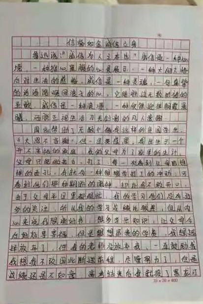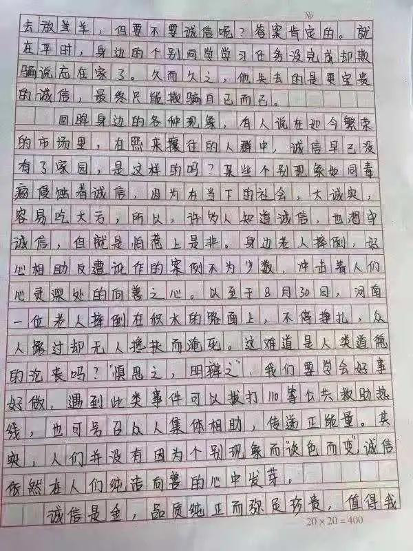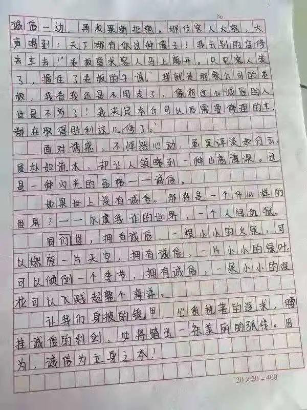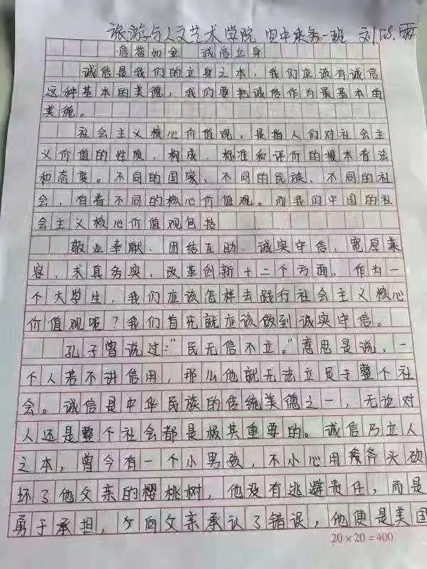 诚实守信,是中华民族的优良传统和当今社会需要大力弘扬的道德规范。为弘扬社会主义核心价值观,落实立德树人根本任务,在学校形成诚信的校风、学风,我院于5月份开展了主题为“诚信立身 ,诚信为本”的征文比赛活动,让我们来看看同学们的风采!