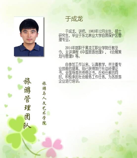 四、部分师资力量 陈洪宏,旅游管理专业教研室主任,副教授,管理学硕士,全国导游人员资格考试口试官,黑龙江省职业院校学生技能大赛暨全国职业院校技能大赛选拔赛中职组导游服务赛项裁判,拥有全国导游员资格证书、出境领队证、旅行社总经理等证书。近年来,主持和参与各类课题24项,公开发表论文10余篇,编写高职高专类教材8本。指导学生获得全国职业院校技能大赛导游服务赛项(即国家A类大赛)三等奖一项,国家B类专业大赛二等奖一项、三等奖两项,黑龙江省级导游服务大赛二等奖两项。