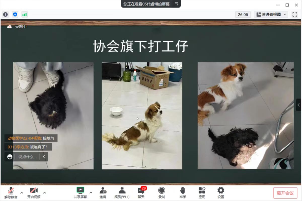 在活动过程中,第五届协会会长动物医学21-05班代睿博介绍了协会发展历程、具体职能、骨干成员分工及本学期活动计划,展示了协会中趣味横生的项目与专业性强的各种技能赛事,强调了对新会员的要求与活动规则,分享了协会旗下小动物们的趣事,引起会员们极大的学习兴趣。