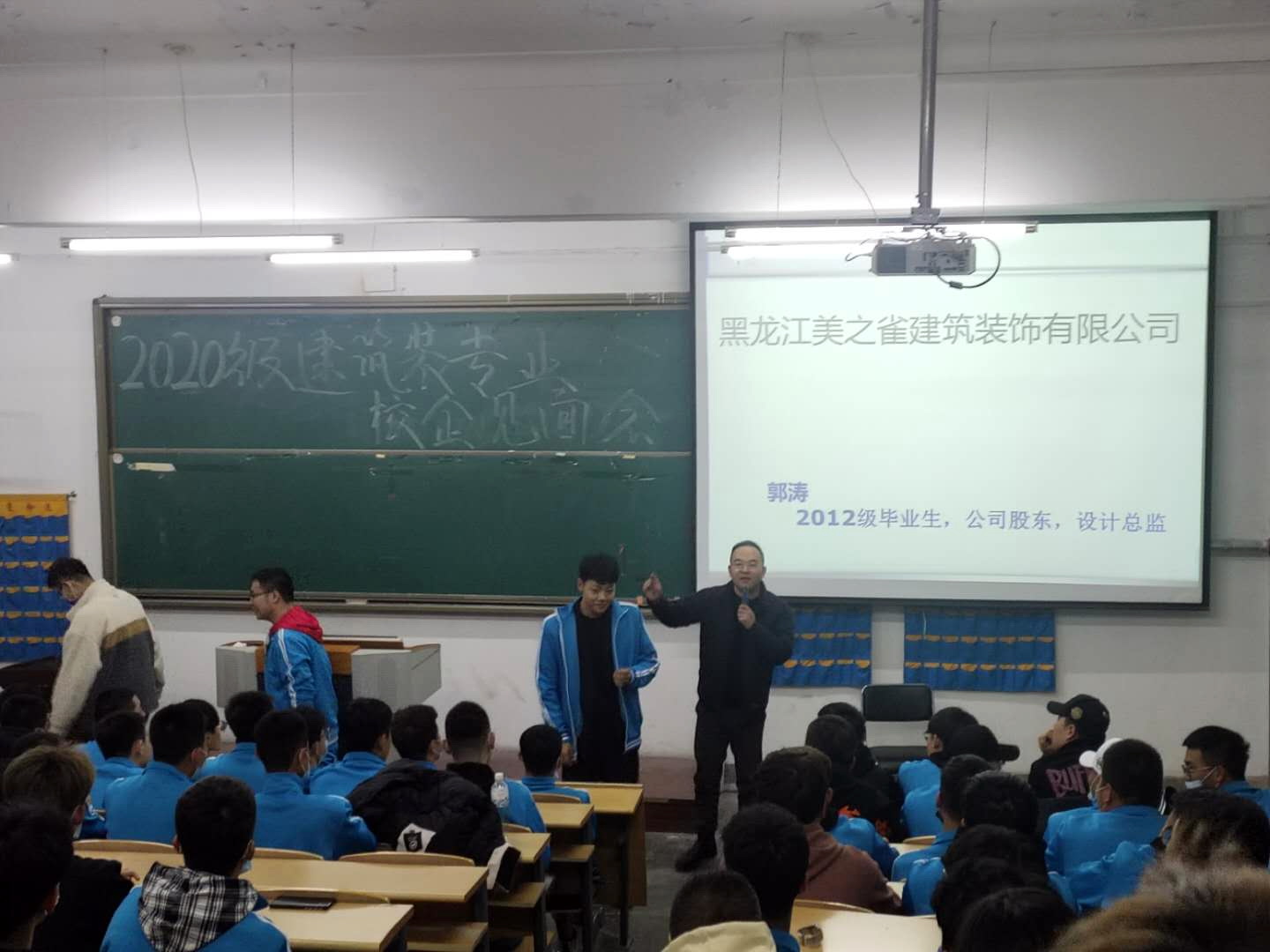 林泉主任首先介绍了建筑装饰专业的专业特点、课程体系及团队任课教师。郭涛经理作为企方代表,同时又为必赢建筑专业2012届毕业生,他从自身职业发展经历、公司基本情况、专业未来就业岗位等方面进行了介绍,并回答学生的问题。