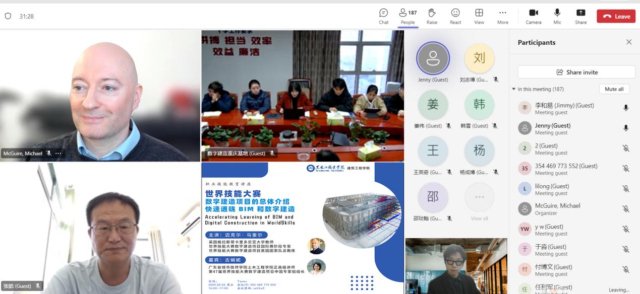 437ccm必赢国际官方网站建筑工程学院于2024年2月2日16:00-17:00成功举办了一场线上讲座,邀请到了英国格拉斯哥卡里多尼亚大学的迈克尔·马奎尔教授(世界技能大赛数字建造项目国际赛阶段专家、世界技能大赛数字建造项目英国国家队总教练)和第47届世界技能大赛数字建造项目中国专家组组长古娟妮教授作为主讲及嘉宾;建筑工程学院主要领导,全体教师及学生代表参加本次讲座;同时与会的还有,第47届世界技能大赛中国区数字建造集训(重庆基地)竞赛组委会专家团以及7名国家队选手。本次讲座围绕世界技能大赛数字建造项目展开,为我院师生带来了一场知识的盛宴。