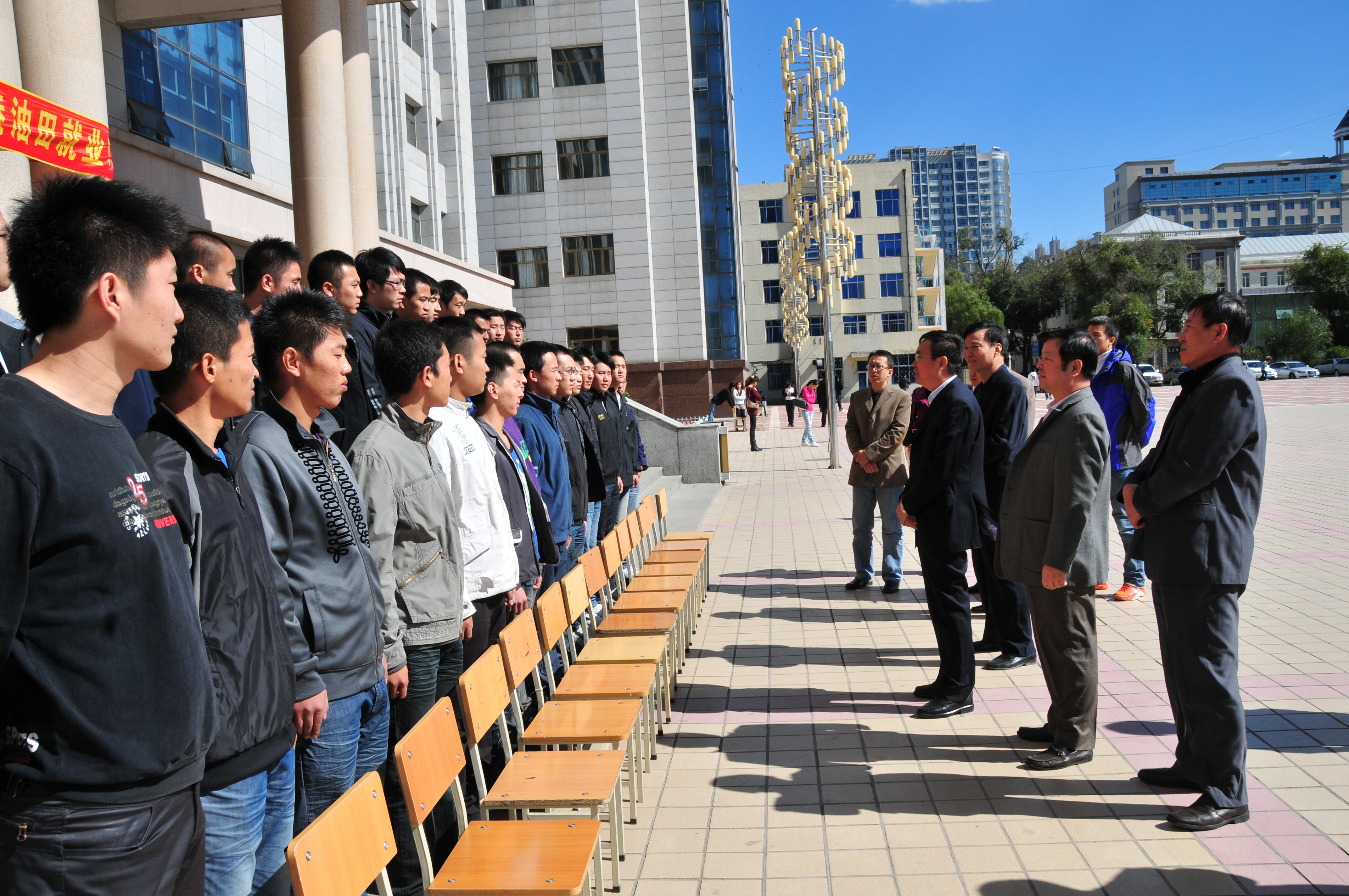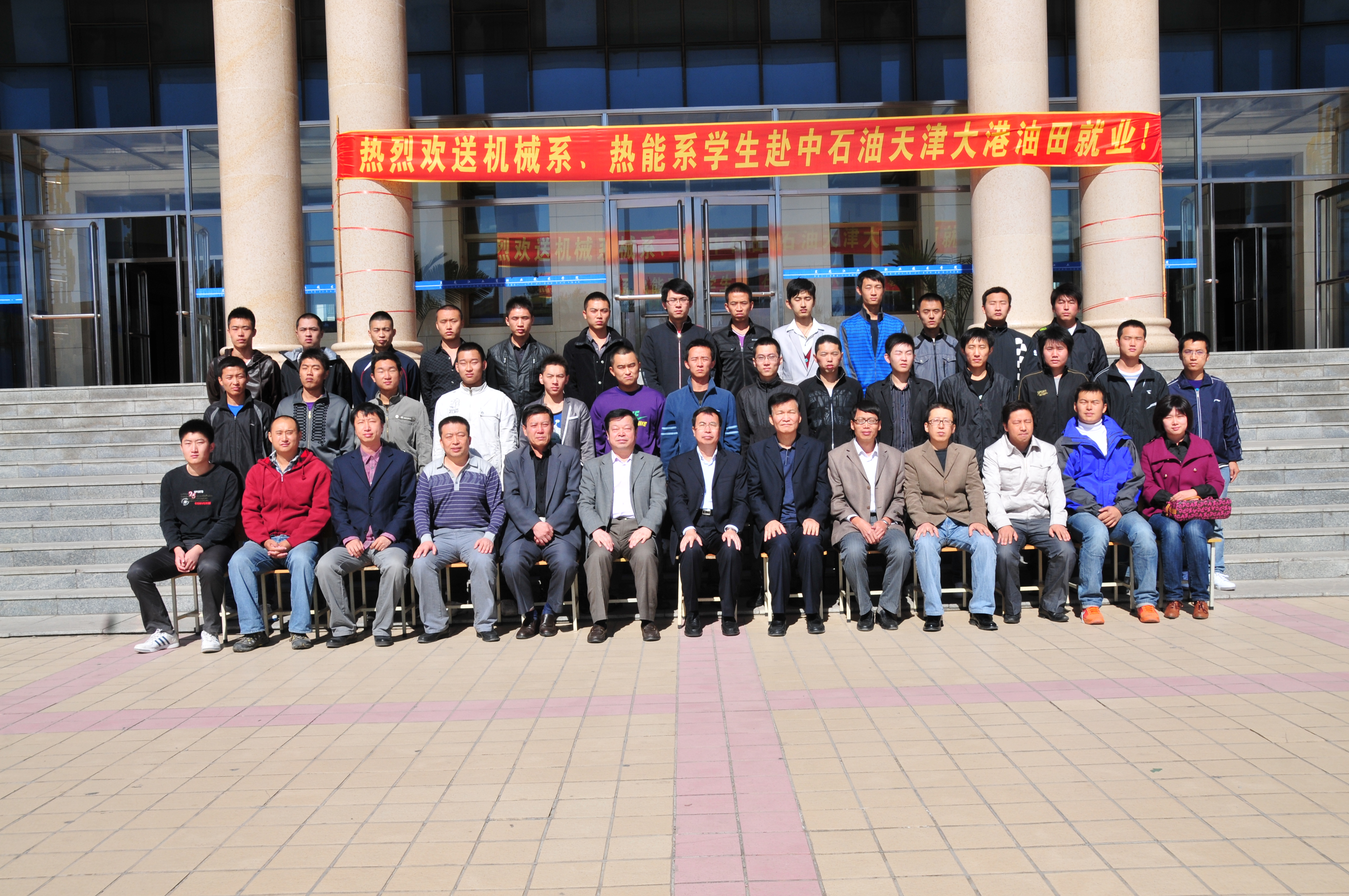 9月23日,热能系和机械系共33名同学赴中石油大港油田就业。大港油田是中石油骨干企业,与学院2006年起建立了良好的合作关系,大港油田待遇好、工资高,学生就业质量好。学院党委书记冯玉龙同志、副院长何承贵同志、副院长刘公远同志及热能系、机械系的负责同志和辅导员参加了欢送仪式,合影留念后学院党委书记冯玉龙同志做了重要讲话,冯书记勉励同学要尽快转换角色、适应环境,加强业务学习,做好职业规划,不辜负学院师生的殷切希望,为工商职院争光,为母校争光。