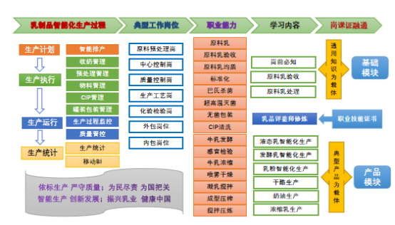 本课程整体设计遵循“成果导向+行动学习”理念,“基于乳品生产岗位工作过程的典型任务”,突出职业技能与岗位需求对接,课程内容分为基础模块和产品模块两部分,基础模块基于乳品生产岗位的通用流程任务:岗前必知、原料乳验收、贮存和运输。这个模块中将从奶源开始进入乳品生产工作场景。产品模块以乳品市场典型产品为载体,突出龙江乳业产品布局特点,以低温奶和配方乳粉为主,基于典型工作任务,以智能化生产的工作过程为主线,学习不同乳制品的加工工艺、质量控制及智能化生产流程,构建“知标准-明工艺- 会操作-懂质控”的岗位核心能力,树立数字化时代乳品加工、乳品质量控制的新工科思维。