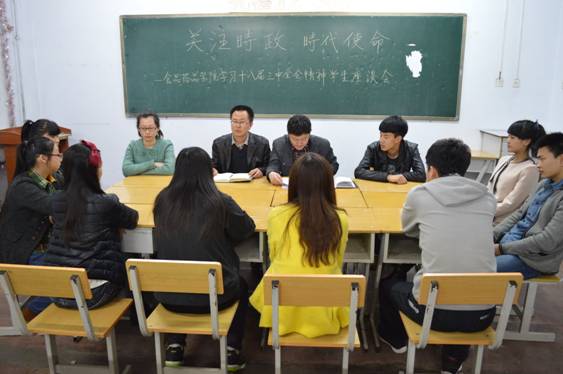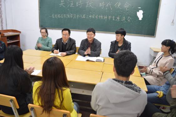 2014年3月27日18时,学管办组织各班学生代表开展了以“关注时事,了解时事”为主题、学习贯彻党的十八届三中全会精神的座谈会。车延平副院长以及左远鹏副主任参与了此次活动,并对党的十八届三中全会上习总书记的重要讲话进行了全面的分析解读。车院长向学生们介绍了党的十八届三中全会传达的主要精神,同时还向学生们深入解读了“中国梦”这一概念, “中国梦”是中国共产党召开第十八次全国代表大会以来,习总书记所提出的重要指导思想和重要执政理念,全面概括了中国的发展方向。座谈会期间学生代表纷纷发言、阐述各自独到的见解,充分体现了学生们对学习贯彻党的十八届三中全会精神的认知与理解。车院长在总结中指出,我院将举办更多此类活动,从而更全面地了解大学生心理,大力提高大学生的素质教育。