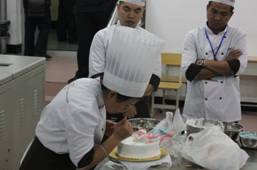 下午一时和三时,戚风蛋糕和创意西点技术两个赛项完成后,裁判长将所有作品都集中在一起,向选手和指导教师进行了详细的点评,使大家受益非浅,同时也交流了心得,切磋了技艺,诠释了设置技能大赛的目的。
