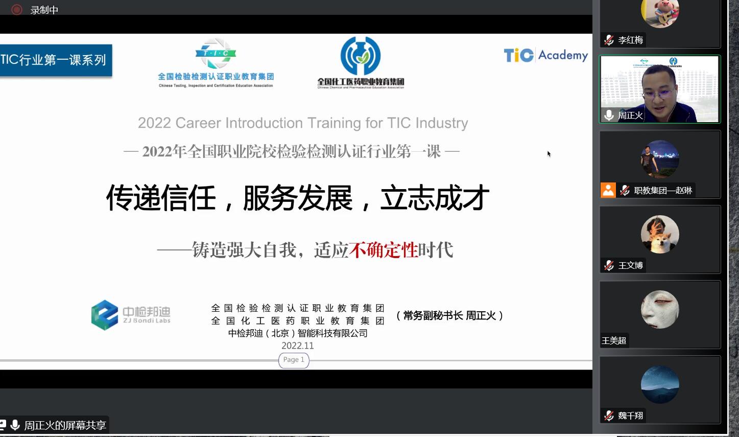 本次培训我院联合中检邦迪(北京)智能科技有限公司,邀请全国检验检测认证职业教育集团常务副秘书长、全国化工医药职业教育集团常务副秘书长,同时也是国内多所TIC产业学院执行副院长的周正火高级工程师作为主讲人,从我国TIC行业的背景介绍入手,详细讲解本行业的发展态势以及检验检测认证人才的就业市场现状并为学生在校学习做以规划,使学生对职业发展方向有一个较好的把握。