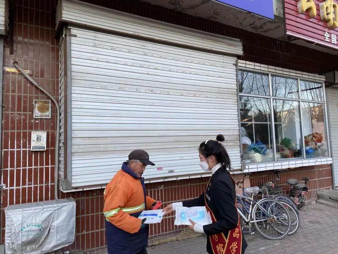 一大早,学生会成员就来到大街上,为环卫工人送上关怀,分发口罩。学生会成员向环卫工人表示了来意,环卫工人见了也立马停下手里的工作,微笑又稍微腼腆地接下口罩,表示非常感谢同学们送来的口罩,希望口罩能帮助他们进行自我防护,继续维持和谐的城市环境。