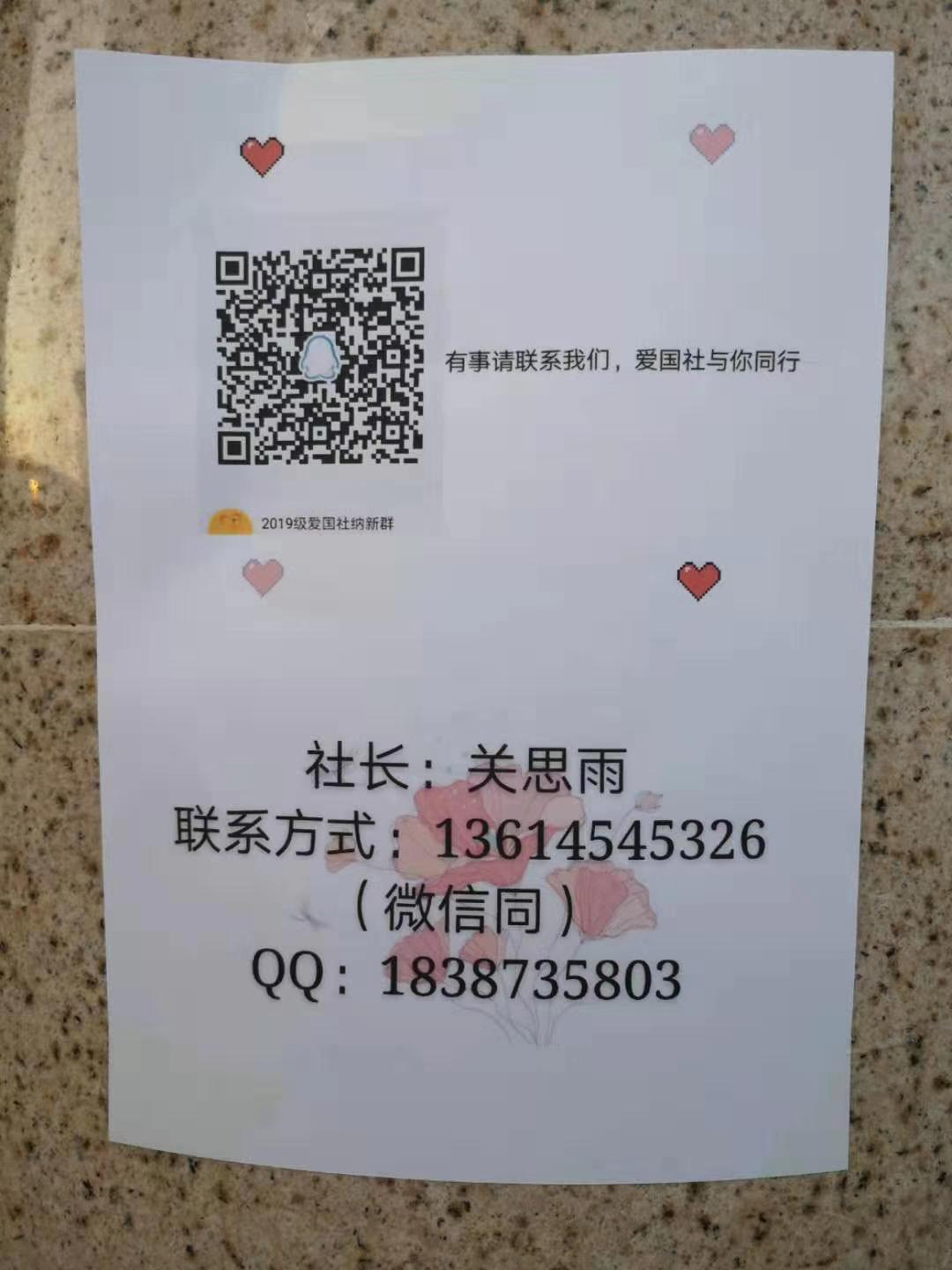 青年爱国社2012年成立,秉承着“树爱国之心,尽爱国之责,行爱国之举”的口号,组织具有爱国主义思想实践类宣传活动,是校级十佳社团之一,期待有更多热血青年加入!