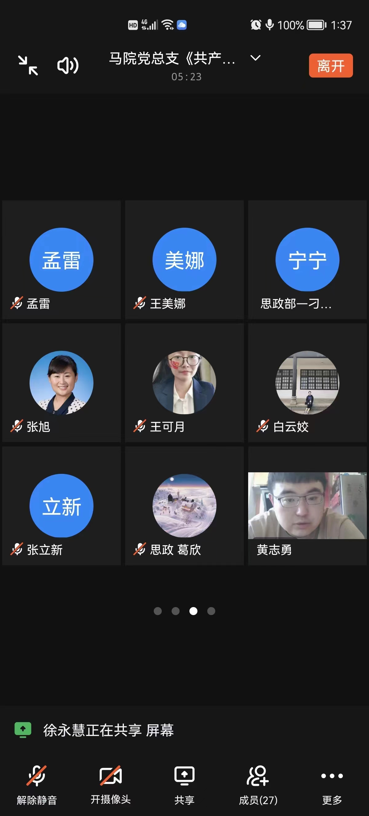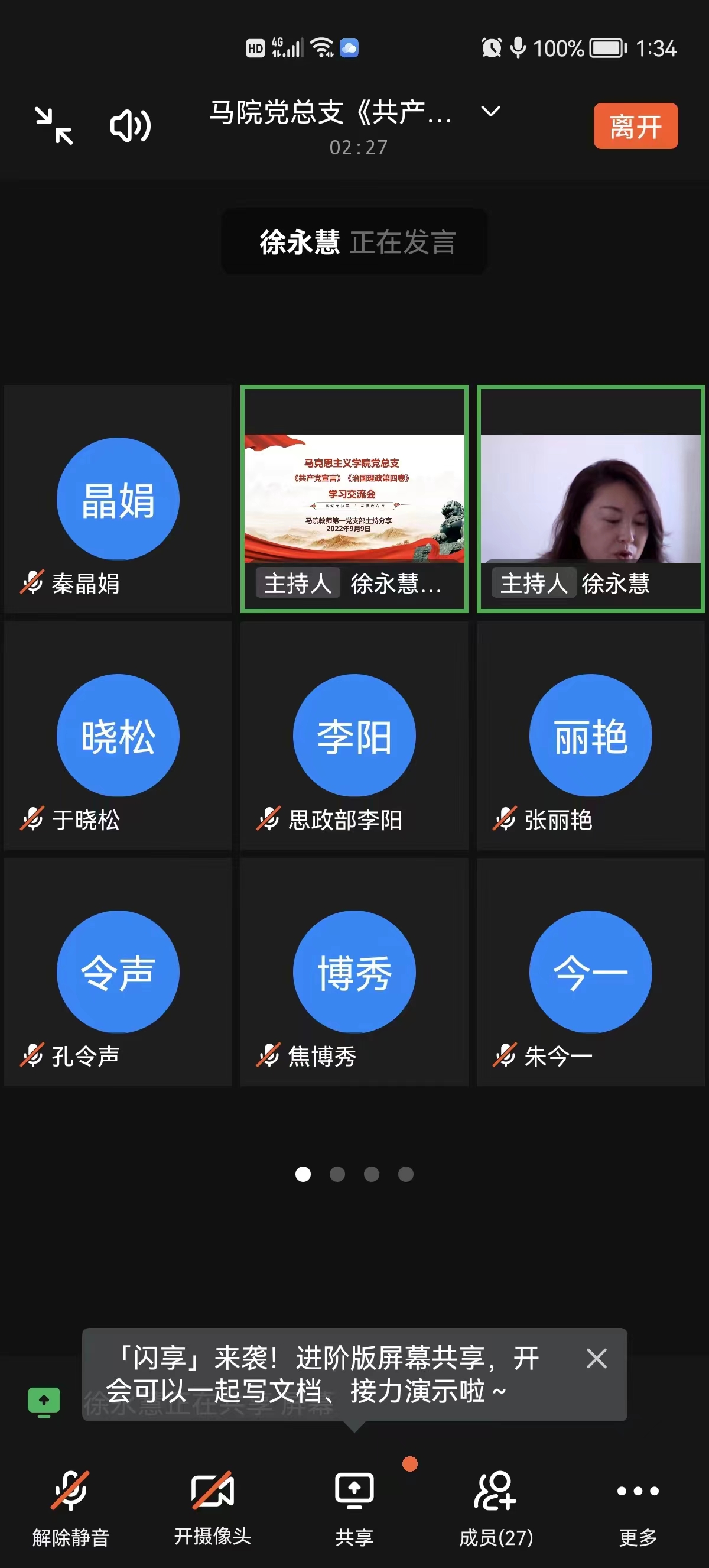 为迎接党的二十大胜利召开,在马克思主义学院党员中形成理论学习的新热潮,马克思主义学院党总支于2022年9月9日下午1点30分召开了集体理论学习会议,本次集体学习由第一支部负责主持和分享,第一党支部书记徐永慧主持,马克思主义学院党总支全体党员参加,采用钉钉会议线上进行,学习内容主要包括《共产党宣言》和《习近平谈治国理政》第四卷。