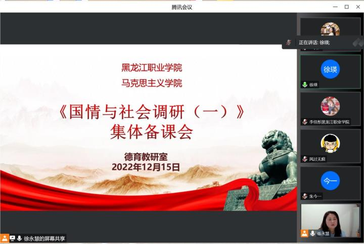 2022年12月15日马克思主义学院德育教研室组织了《国情与社会调研》第一次集体备课与教学研讨线上会议。会议由德育教研室徐永慧主任主持,徐瑛副院长和全体德法课教师参加。
